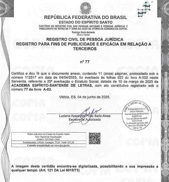 Artigo lº A ACADEMIA ESPÍRITO-SANTENSE DE LETRAS, fundada em 04 de setembro de 1921, reorganizada em 18 de setembro de 1937, filiada à Federação das Academias de Letras do Brasil, inscrita no CNPJ (MF) n°27.270.883/0001-06, registro primitivo de N° 77, do livro A-03, de 30 de outubro de 1937, reconhecida como de utilidade pública pela Lei n° 306/1949 e consolidada na Lei n° 10.976/2019, é uma associação civil, de caráter cultural e sem fins lucrativos, de duração ilimitada, com sede e foro na cidade de Vitória, Capital do Estado do Espírito Santo, na R Com Duarte Carneiro, s/nº, Centro (CEP 29.015-060). Tem por finalidade o cultivo da língua nacional e da cultura literária, dentro do espírito de fraternidade que vincula o Espírito Santo aos demais estados do Brasil, e o Brasil aos demais países do mundo.
